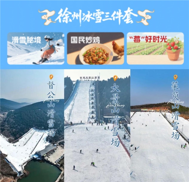 此次特别推出的“徐州冰雪三件套”板块,涵盖滑雪秘境、国民炒鸡、"莓"好时光三大特色体验。汇集贾汪区大景山、督公山、茱萸山及铜山园博园多个滑雪场,以及凤鸣海“童话雪乡”、松鼠咔咔戏雪乐园等主题园区,丰富冰雪娱乐供给。依托贾汪、铜山、经济开发区等地的草莓产业园与现代化休闲农场,推出冬季农事采摘活动。并以磨石塘炒鸡一条街为代表,串联徐州地锅鸡、蒜爆鱼、烧烤等美食IP,赋能“冰雪+田园+美食”融合业态提质升级。