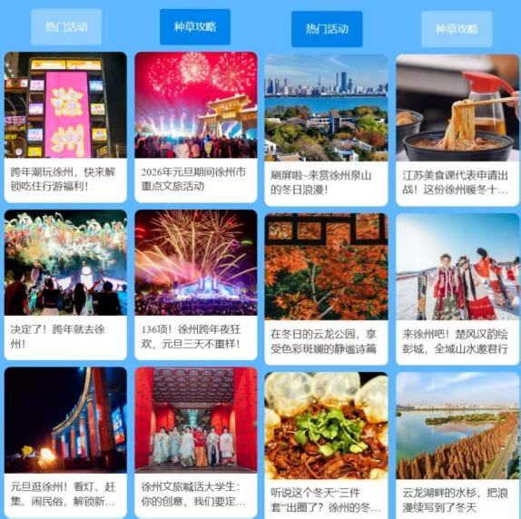 此外,旗舰馆整合必玩景点、彭城七里、美食荟萃、乐享田园、精品酒店、铁旅启程等主题,以全景视角展现城市文旅资源。
